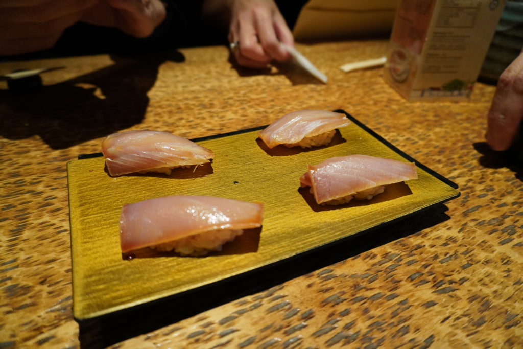 はい、鰤ですね。江戸前のお寿司は生の切り身を直接出すのではなくて、食べやすいように何かしら工夫してあるのが素晴らしいです。もともとは保存するための知恵だとか。