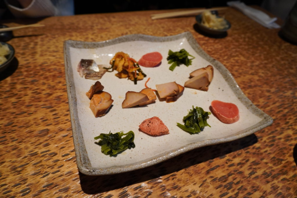 なんですか、この美しい盛り合わせ。うちの子、左上、は辛いものが食べれないと伝えてあるので、わさび菜と明太子のかわりにサバの焼いたものなどが代わりに置いてあります。素晴らしい。
