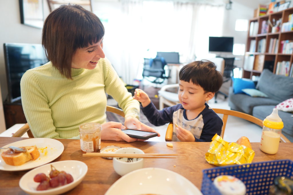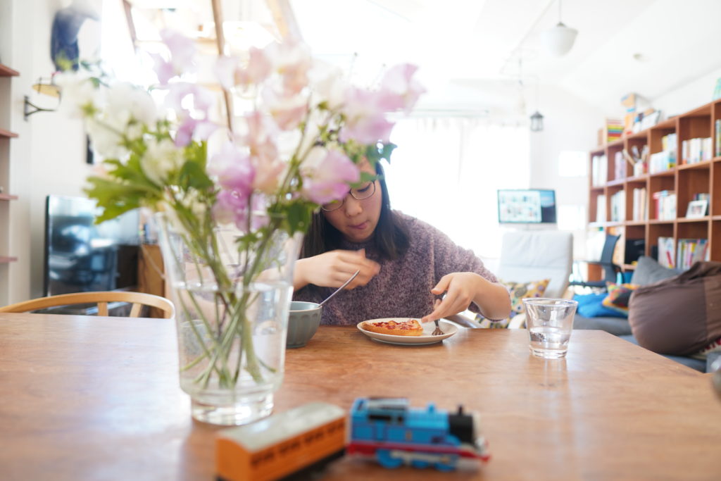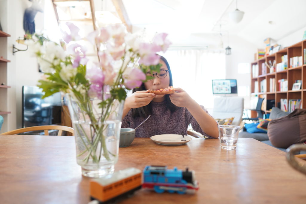 ある日寝坊して起きてきたら、パンの耳に作ったピザトーストがありました。恐竜のマグカップはマレーシアで買ったもの。よく割れなかったな。