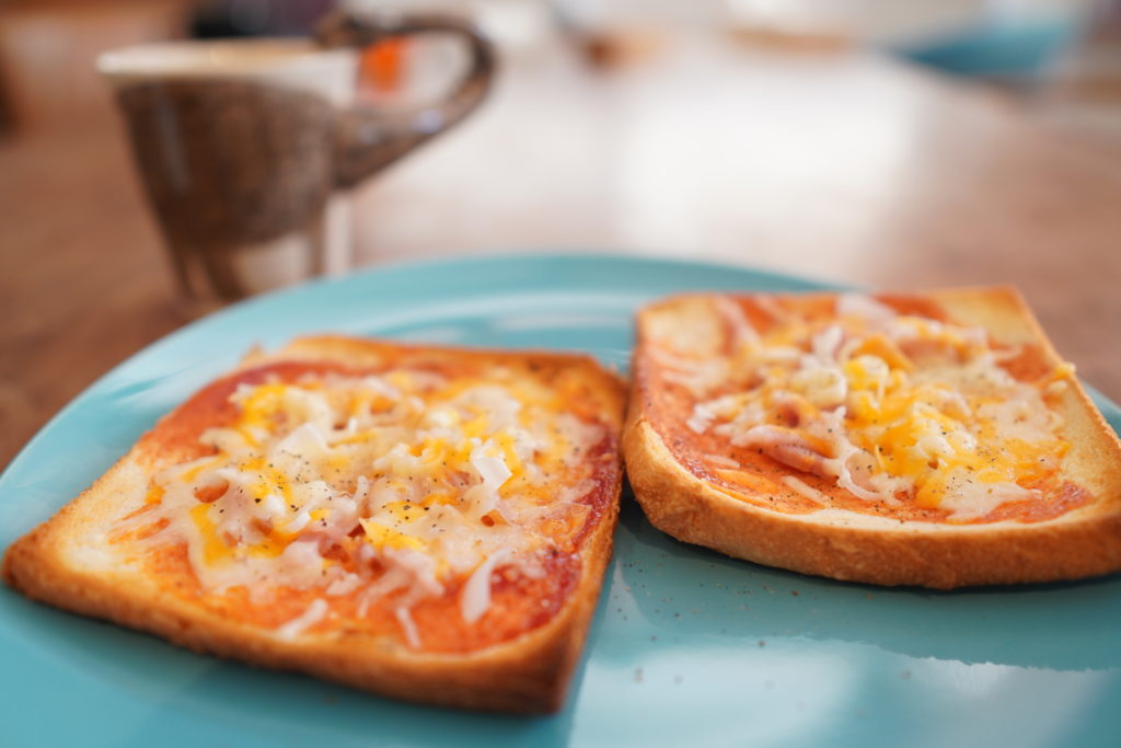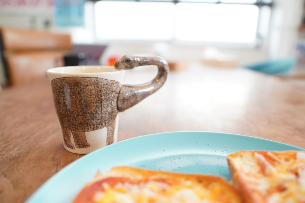 ある日寝坊して起きてきたら、パンの耳に作ったピザトーストがありました。恐竜のマグカップはマレーシアで買ったもの。よく割れなかったな。