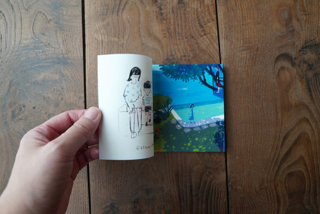 小さなことなのですが、レイアウトや紙選び、イラストの配置や文字の形まで美しくて本当に気に入っています。私が作ると、「全部大きく見せたい」気持ちが強すぎて結果みにくいレイアウトになってしまうんですね。。さらに今回は私がいつもインスタにアップしていた子育てスケッチもインスタの仕様に似せて正方形でつくってもらいました。綴じの赤い糸がかわいいです。