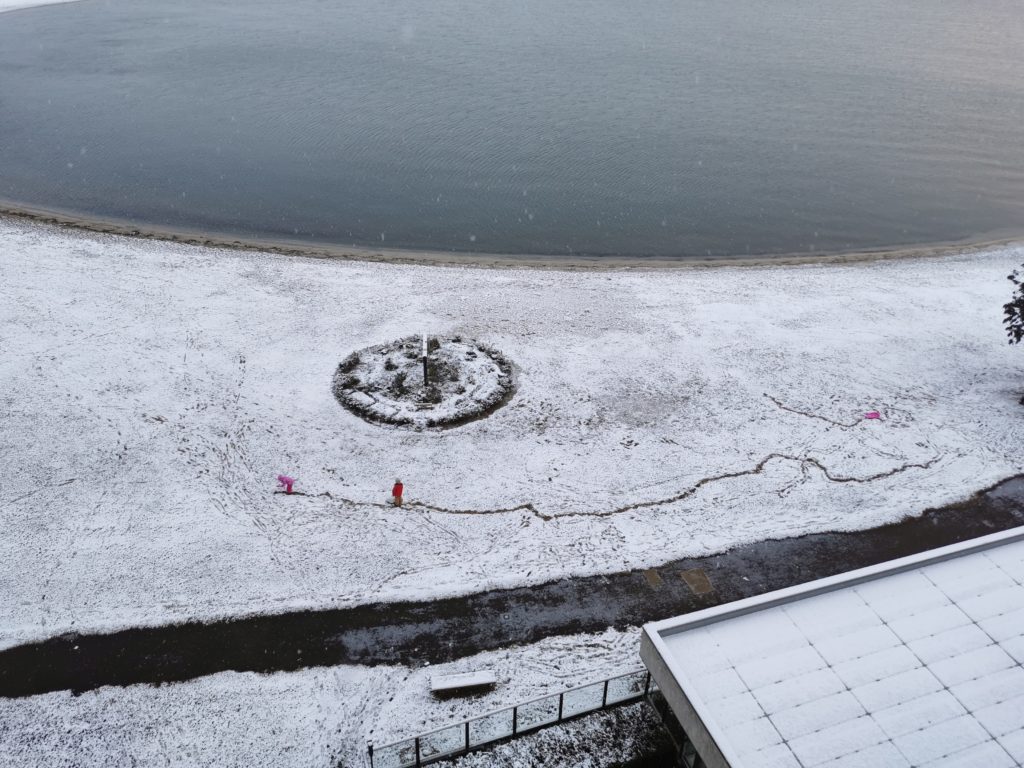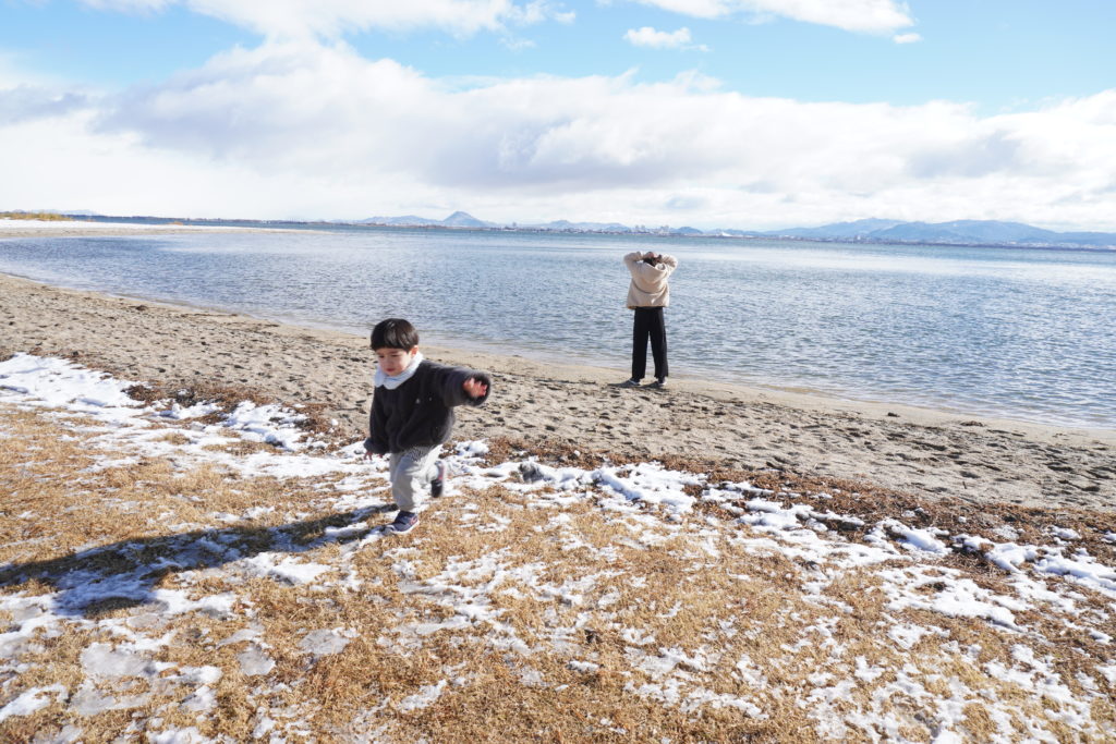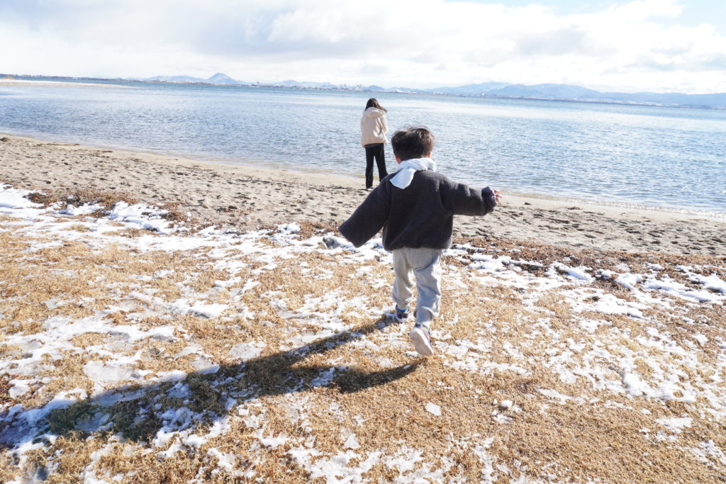 しんしんと雪の降る琵琶湖、すごくきれいでした。赤とピンクの上着を着た子どもたちが遊んでいるのもかわいらしい。いつかこの写真で絵を描きたいな。