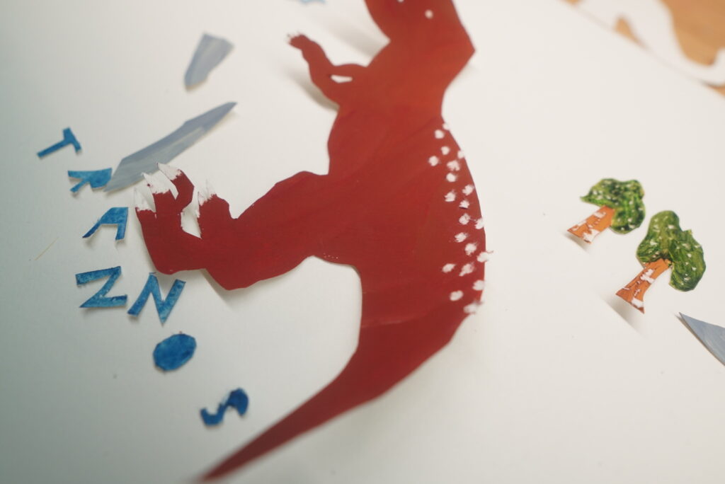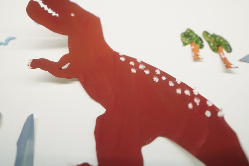 背中や爪の部分は彫刻刀やカッターで削っています。絵を描いているのに立体のような彫刻のような作業をするのは楽しいです。