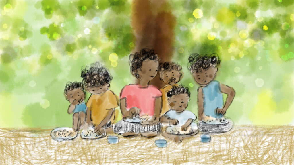 無事にキャンプについて木の下で食事をとるシーン。今回描いた中で一番好きなシーンです。