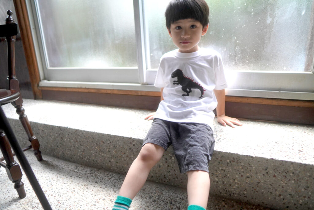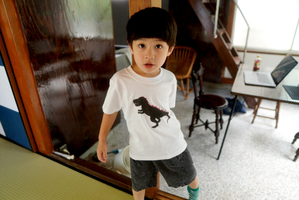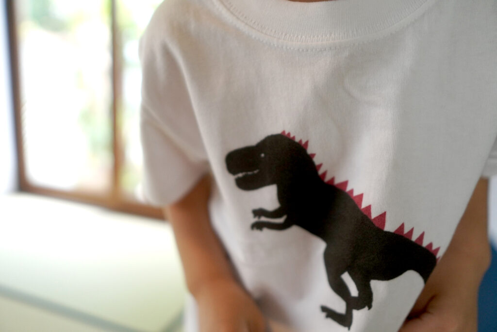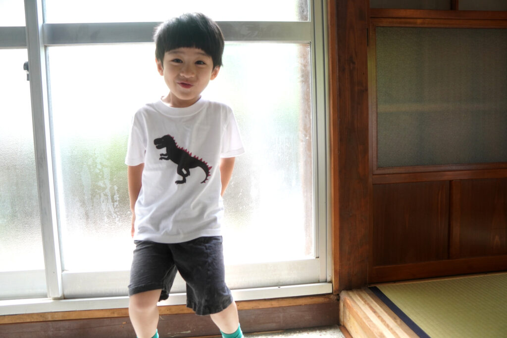 ティラノサウルスTシャツ着て、この夏も最後まで精一杯うごきまわれー(ついていく親は大変だけども。。)