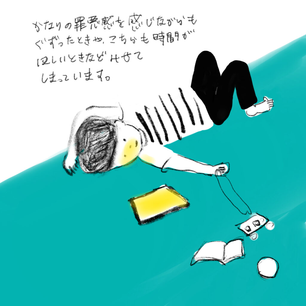 イラストは壁によりかかって仰向けになりながらiPadをみている息子。すごーく自由です。