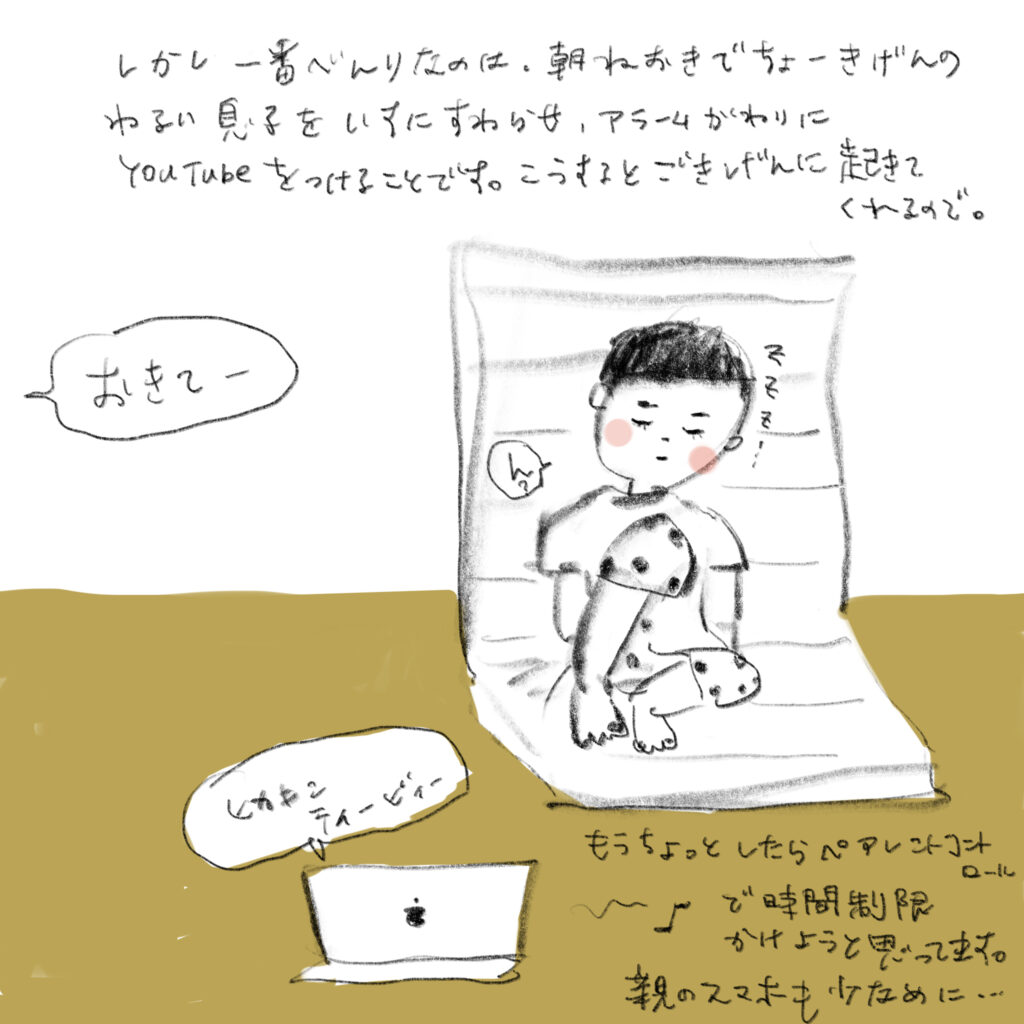 いいことも悪いところもいろいろ書きましたが、うちで一番便利な使用方法は寝起きが最悪な息子のアラームとしてのYouTube利用です。