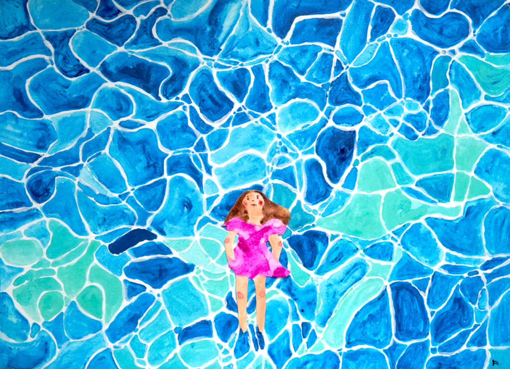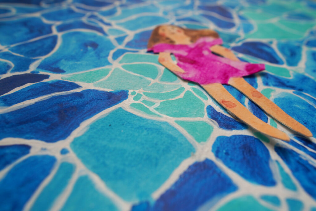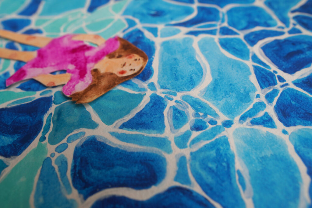 こちら、水面をアルシュに描いてから、切り絵で女の子を描いています。