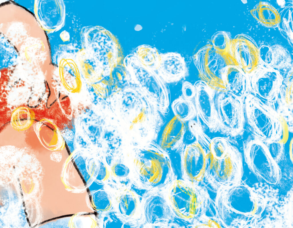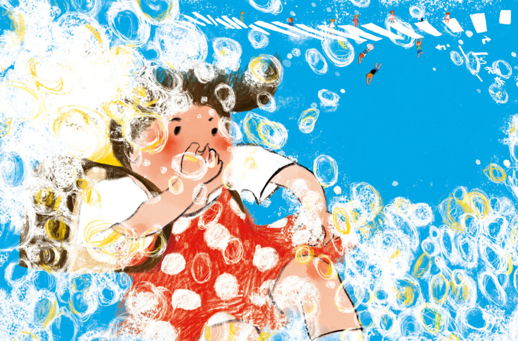 すると、朝顔がひゅーっとのびて、きらきらと光る水のシャワーを出し、掲示板の中が水でいっぱいに。泳ぎが得意ななぎちゃんは、ばっしゃーん、ぶくぶくぶく、中に飛び込みます! 泡のすきまから、遠くに人かげが見えたので、泳いでいってみると……?