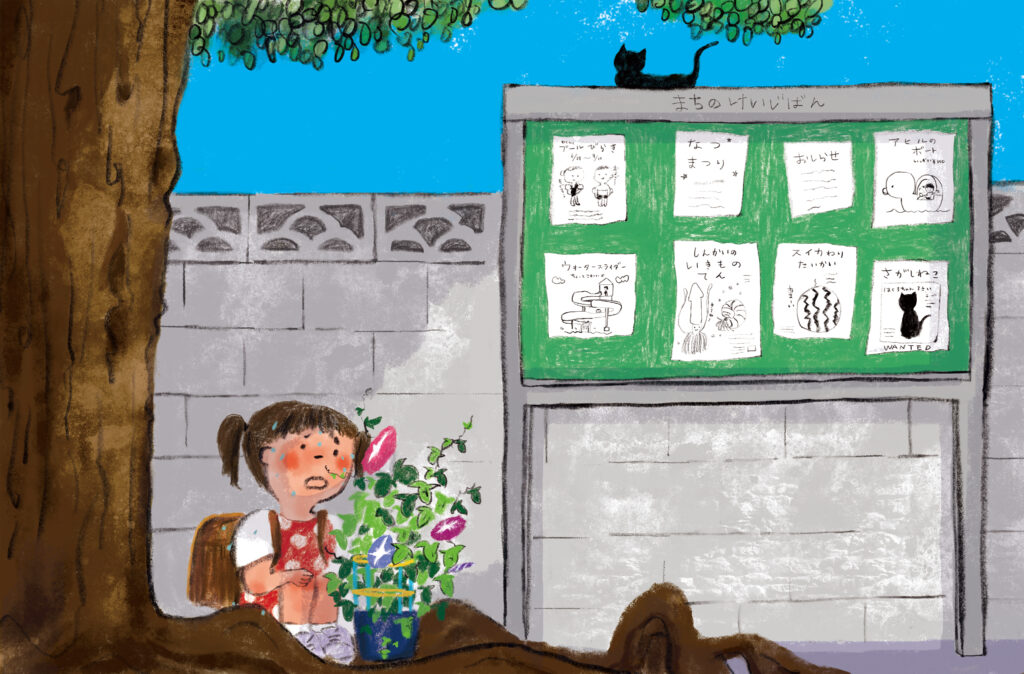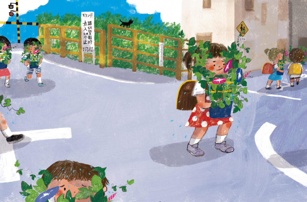 明日から夏休みの今日、なぎちゃんは、暑い中を朝顔を持って帰らなければなりませんでした。