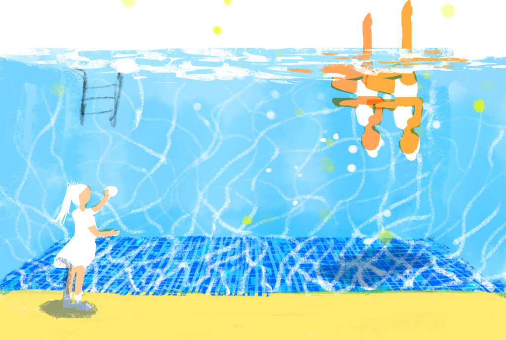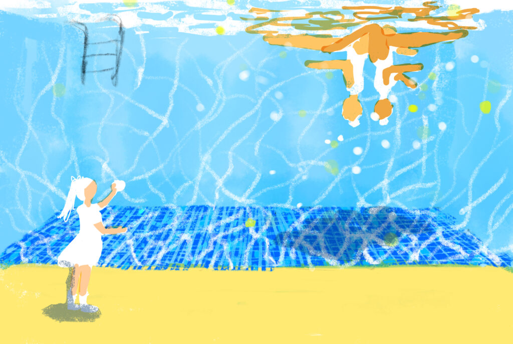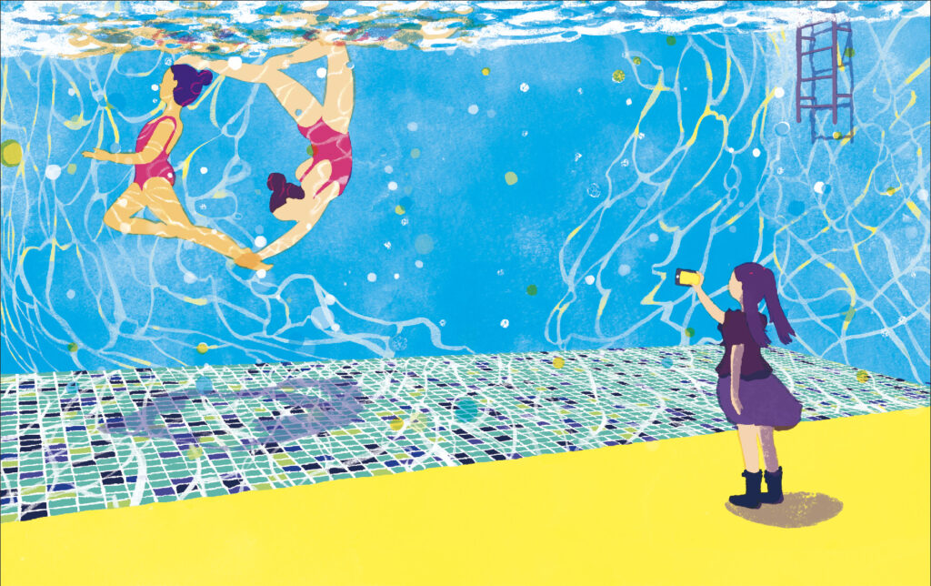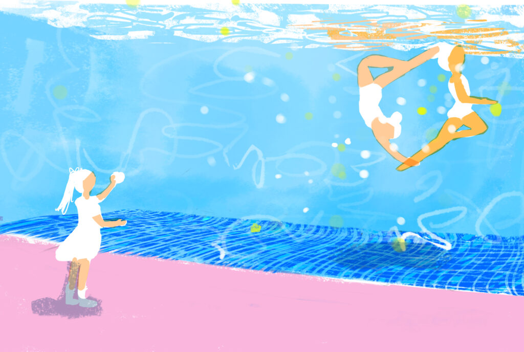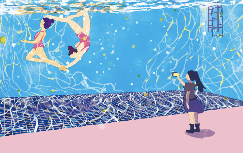 少女のうちの一人が自宅に練習用のプールをもっていて、もう一人がその練習風景を下から撮影するという場面です。