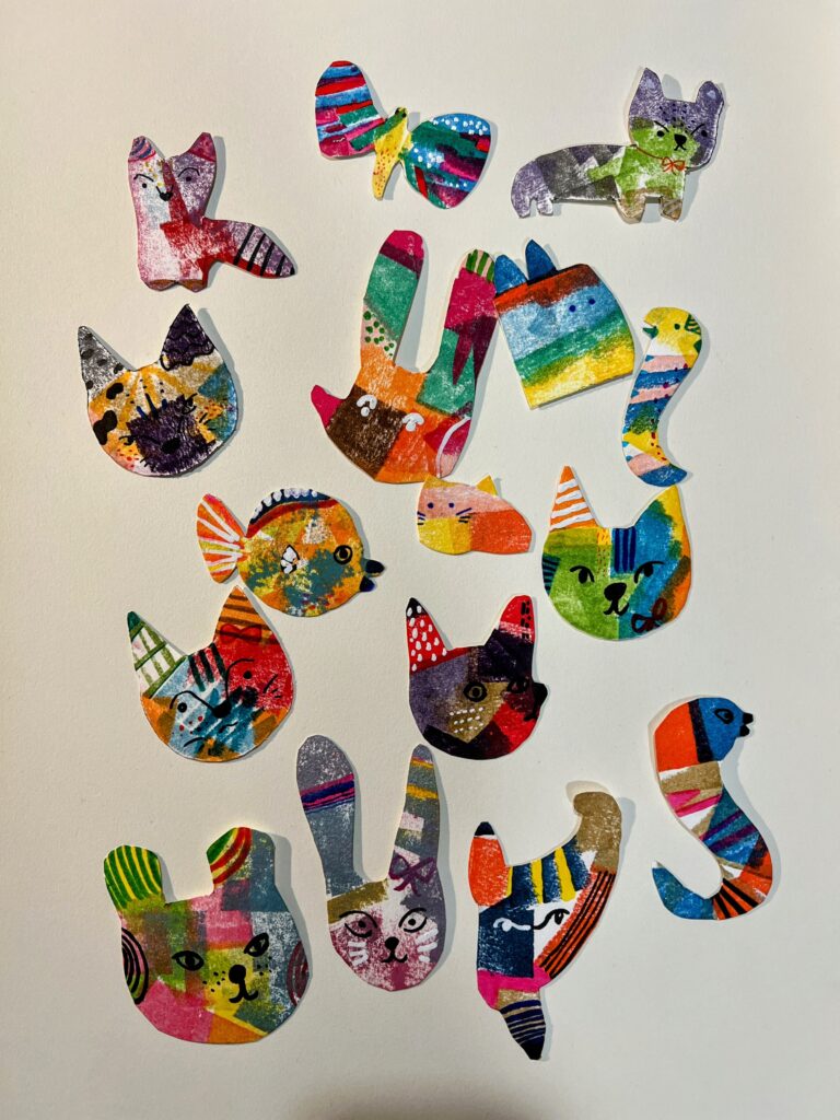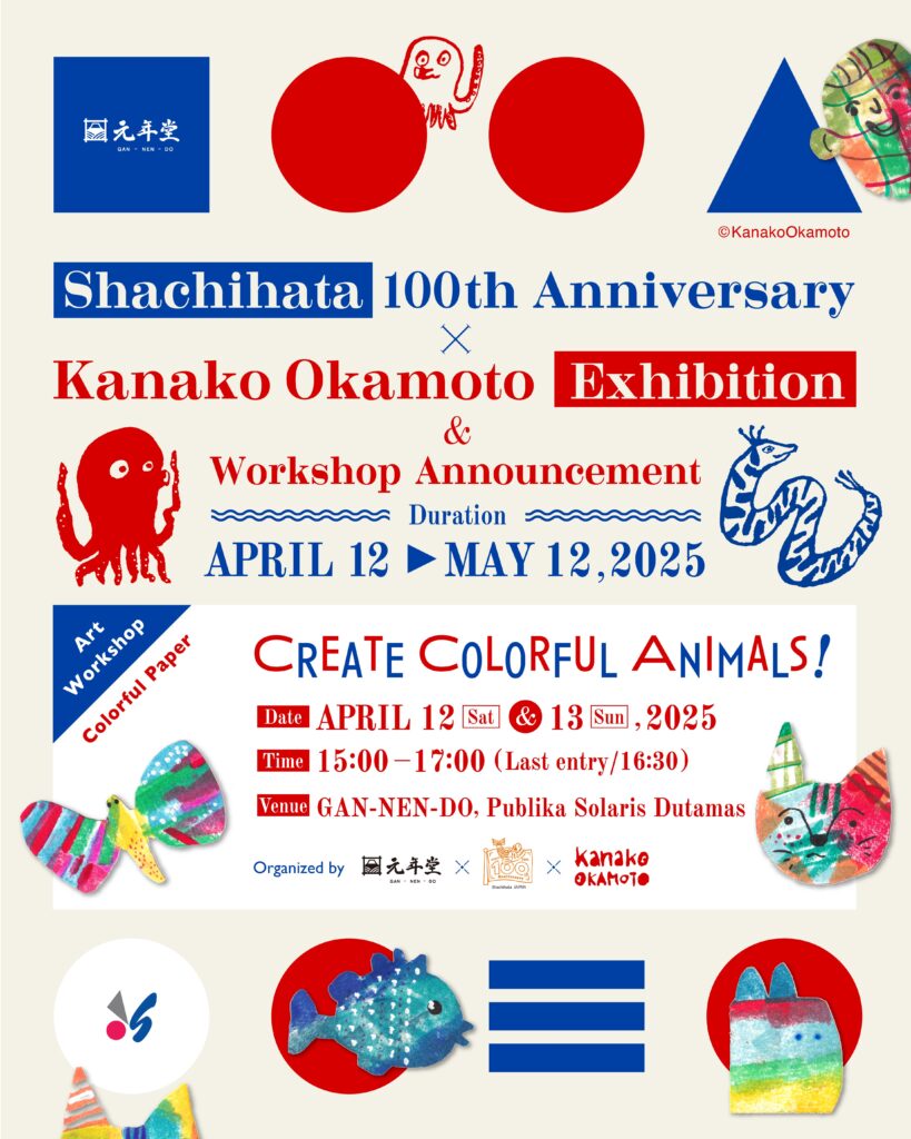 今回のワークショップは、一昨年に全国の図書館を巡回した絵本展「およいでいえにかえりたい」で、こどもたちに大人気だった“切り絵あそび”を、Shachihata 100周年バージョンとしてアレンジしたものです。