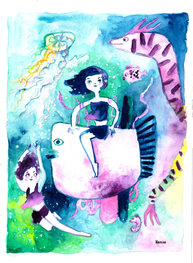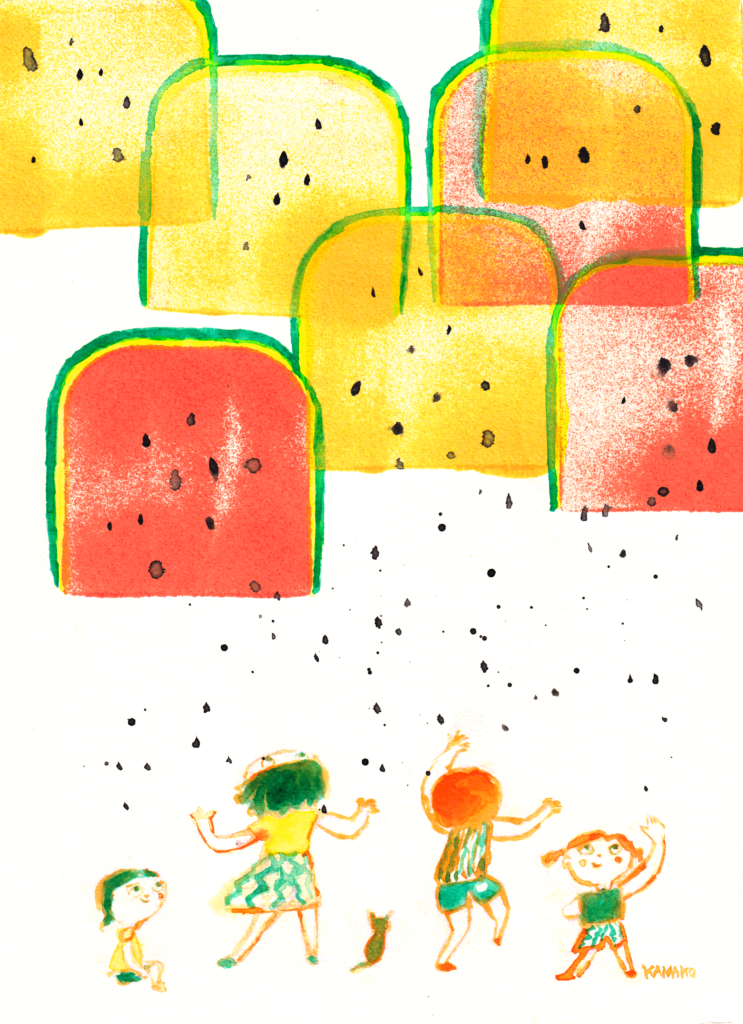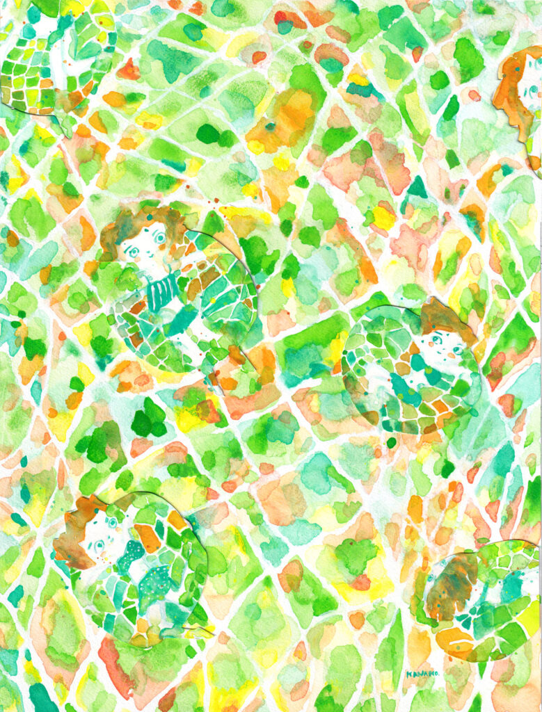 また、南国のフルーツ、水の中のような浮遊感、重力から解放されるようなイメージも、絵の中に込めています。